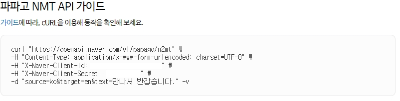 2. 파파고 NMT API 가이드 확인하여 변수 설정