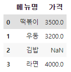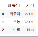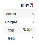 df["메뉴명"] = ["떡볶이", "우동", "김밥", "라면", "만두"]