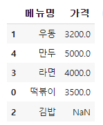 df.sort_values(by=["메뉴명", "가격"], ascending=[False, True])
