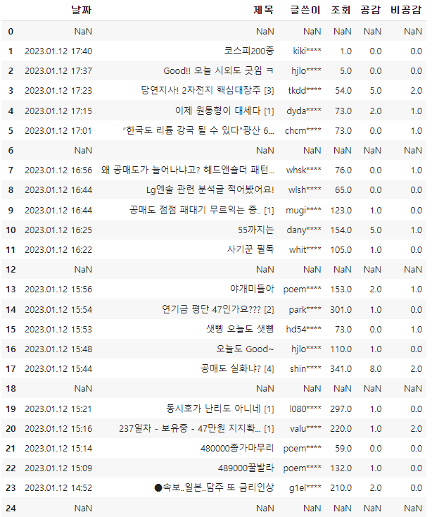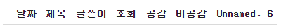cols = ['종목코드', '종목명', '날짜', '답글여부', '제목', '내용', '글쓴이', '조회', '공감', '비공감']